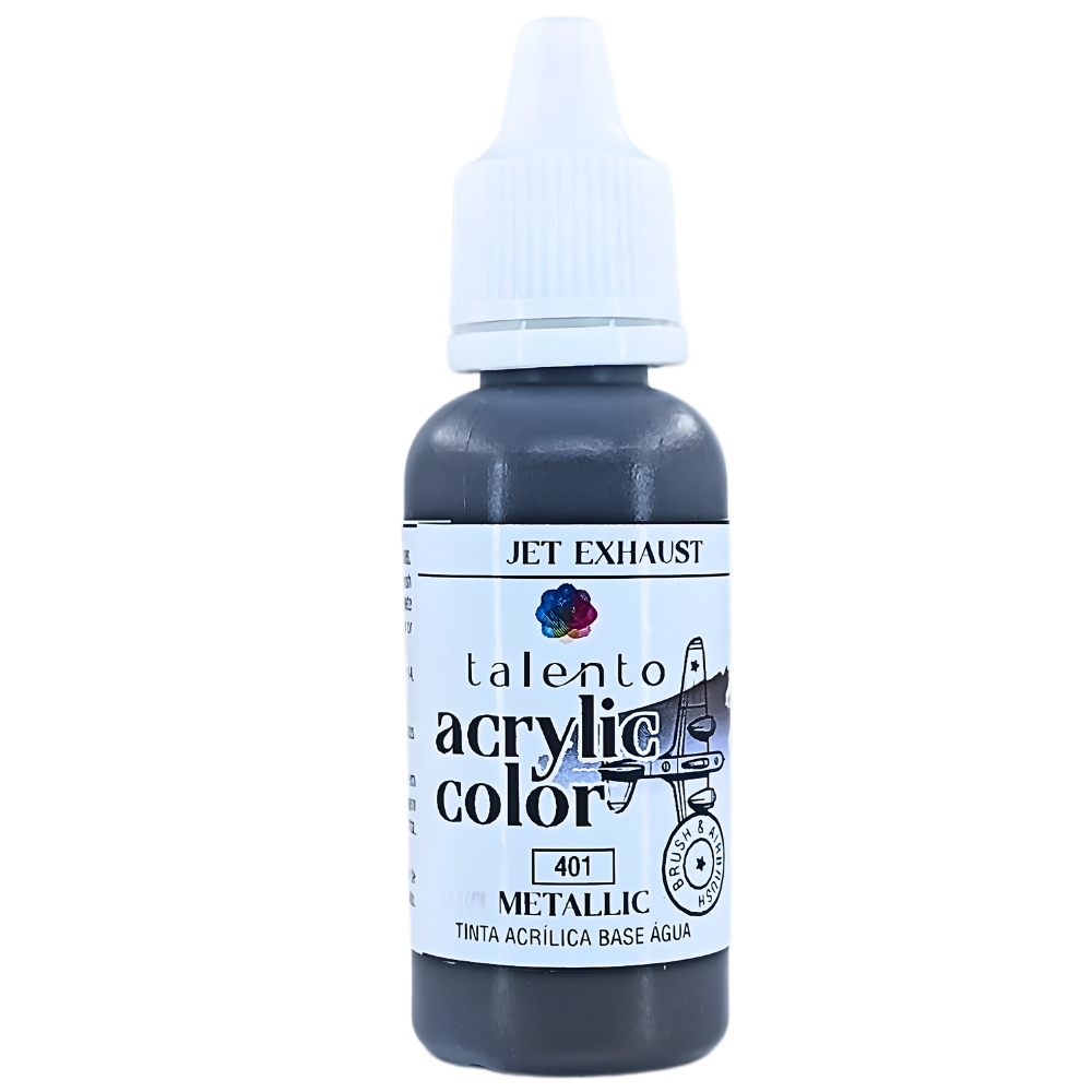 Tinta acrílica para uso em aerógrafo e pincel. Tinta a base de água. Agite antes de usar. Cura completa em 12 horas. A tinta metálica só deve ser diluída com Airbrush Thinner Talento.